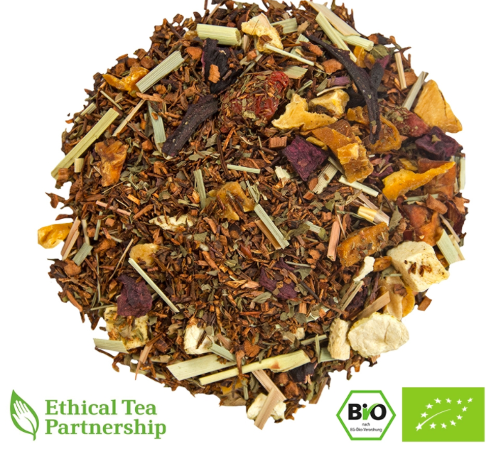 Rooibos Super Grade, honeybush*, citroenschil*, papaya*, pepermunt*, citroengras*, natuurlijk aroma, hibiscus*, mango stukjes*. *gecertificeerd biologische teelt.